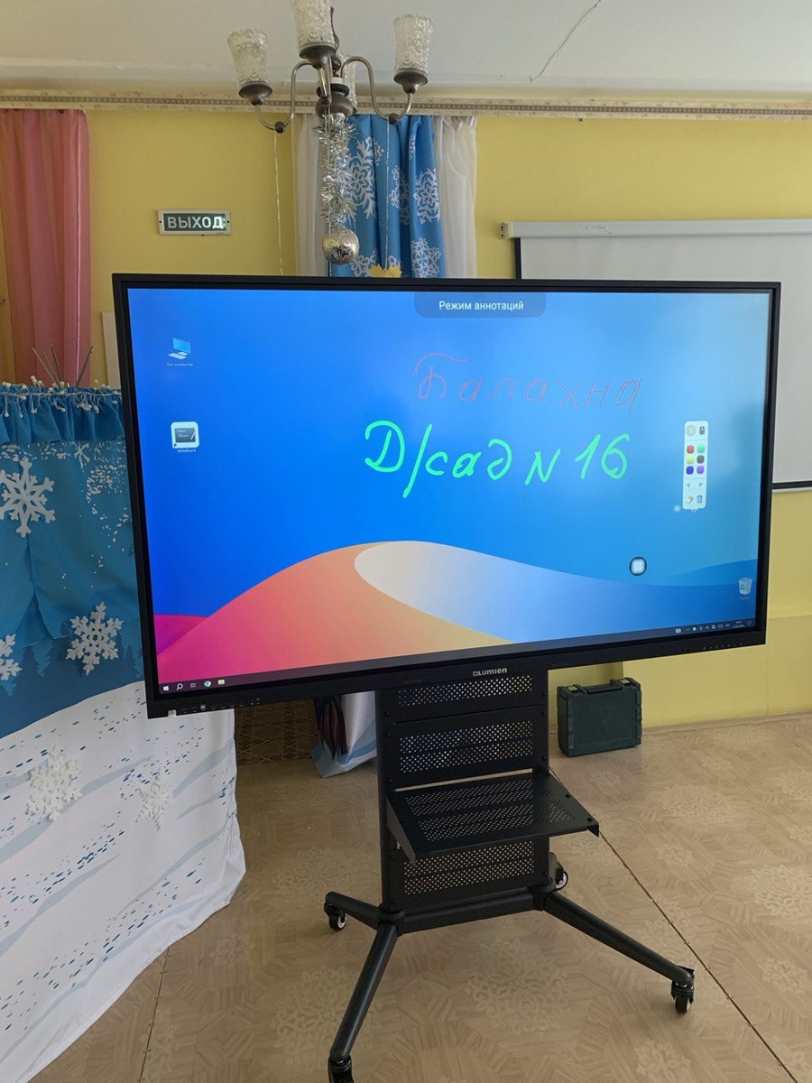 В МБДОУ детский сад № 16 г. Балахна мы поставили интерактивный комплекс с экраном 75” на мобильной стойке.