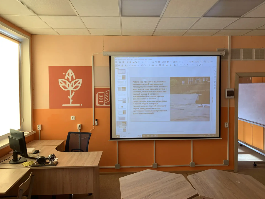 Монтаж оборудования завершили в кратчайшие сроки: специалисты закрепили проектор под потолком, установили экран и подключили всю систему так, чтобы ей было удобно пользоваться прямо во время занятий. Техника полностью готова к ежедневной нагрузке.